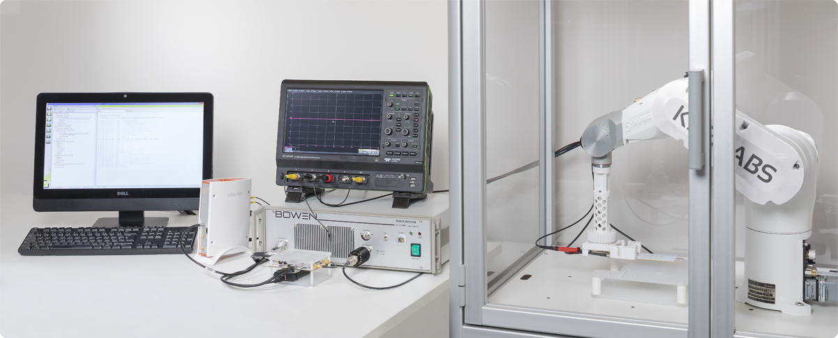 In order to provide a complete test solution with the most efficient tools on the market, KEOLABS has surrounded itself with the best industrial equipment suppliers. KEOLABS EMVCo bench is composed of a 6-axis robot with an accurate positioning system, a state-of-the-art oscilloscope, a robust amplifier and a KEOLABS tester, supplied with SCRIPTIS software and EMVCo certified test suites.
